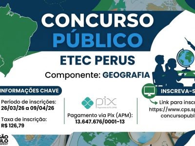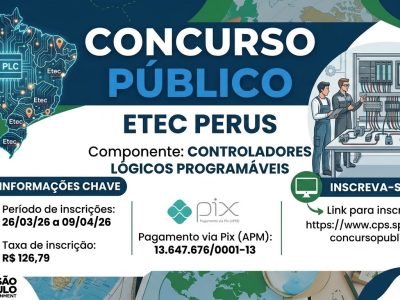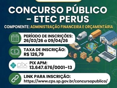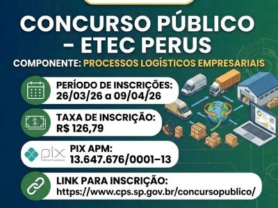 A Etec Perus Gildo Marçal Bezerra Brandão comunica a abertura das inscrições para o Concurso Público para Professor de Ensino Médio e Técnico. A inscrição deverá ser efetuada pelo candidato no período de 26/03/2026 a […]